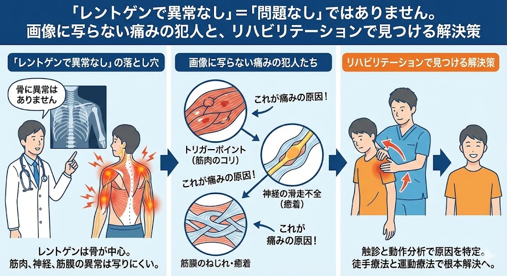 しかし、整形外科のリハビリテーションの現場から断言できることがあります。「レントゲンで異常がない」ということは、「痛みの原因が存在しない」という意味ではありません。それは単に、「レントゲンというカメラには写らない場所に原因がある」あるいは「静止画では判断できない問題が起きている」というだけの話なのです。