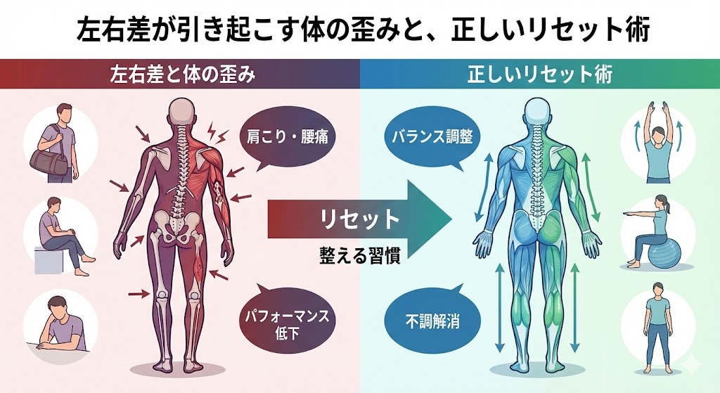 つまり、重いカバンを持つということは、「左右非対称な筋力トレーニングを、長時間強制的に行っている」のと同じことなのです。これでは、左右の筋肉のバランスが崩れてしまうのも無理はありません。