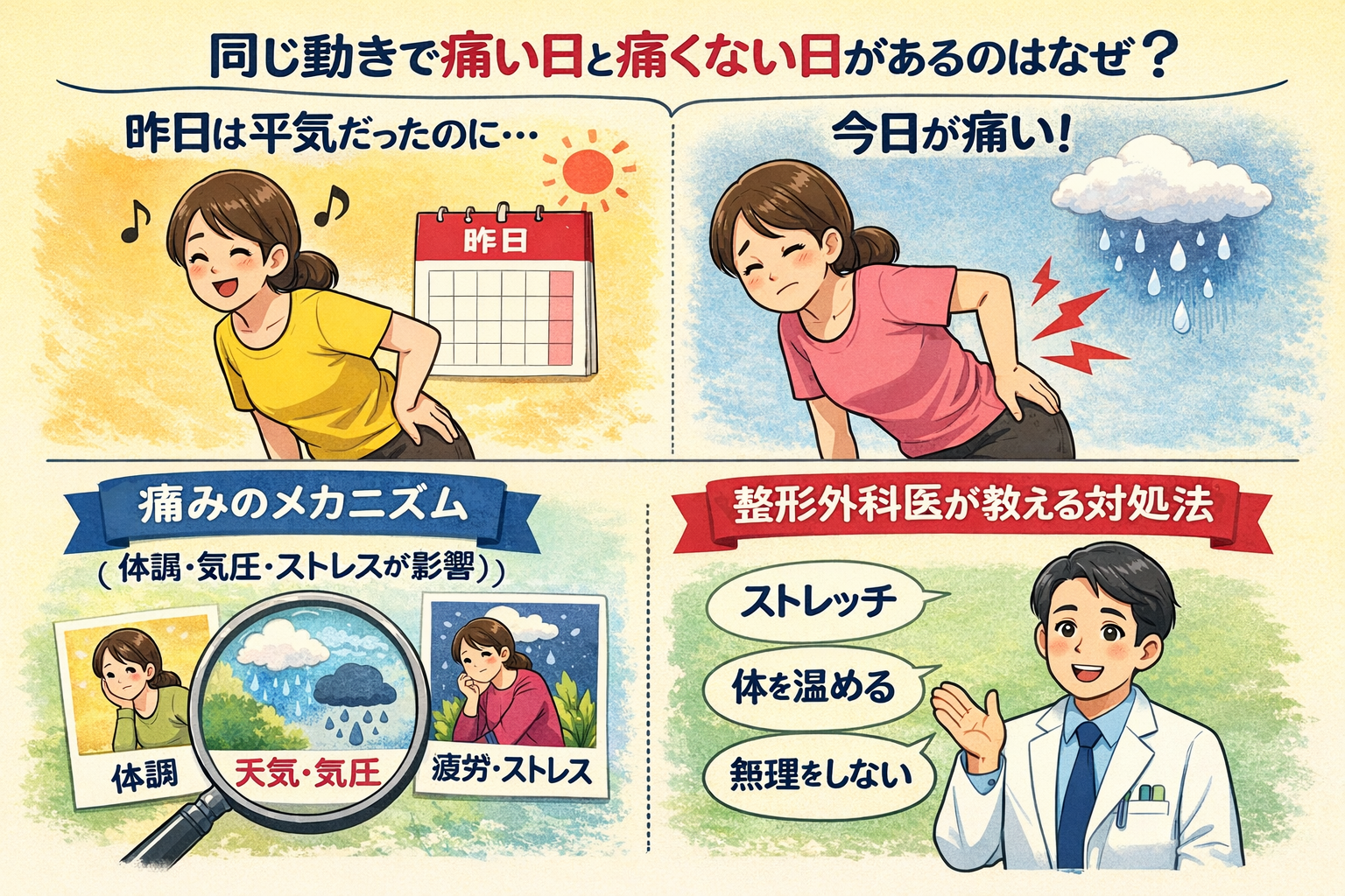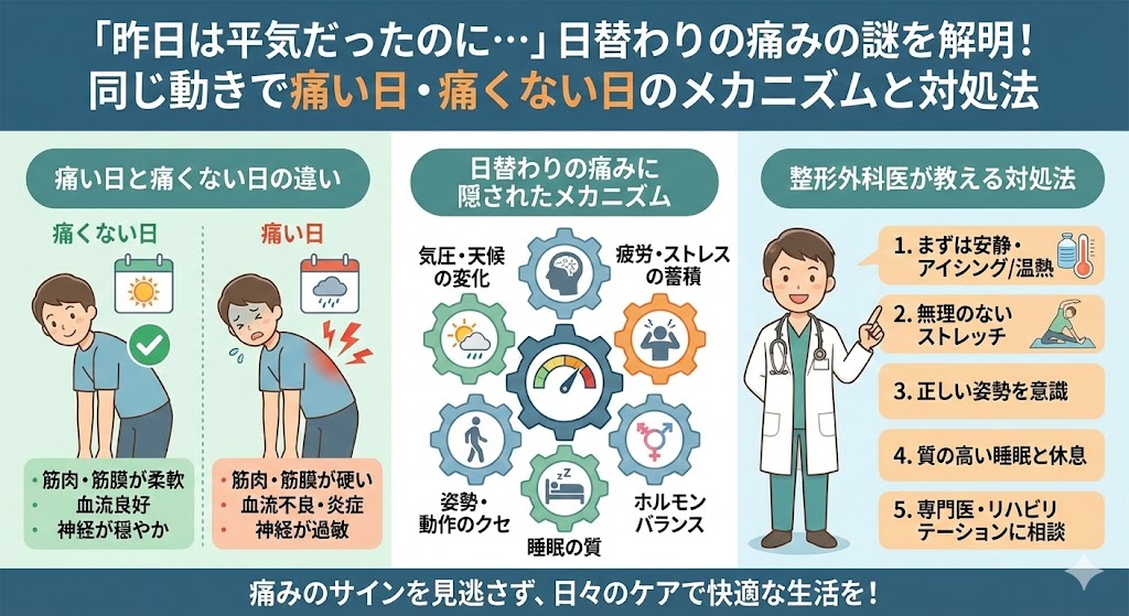同じ動作をしているのに、日によって痛かったり、痛くなかったりする。 この現象に直面すると、「治っていないのではないか」「悪化しているのではないか」と不安になったり、あるいは周囲から「気の持ちようじゃない?」と言われて傷ついたりすることもあるかもしれません。