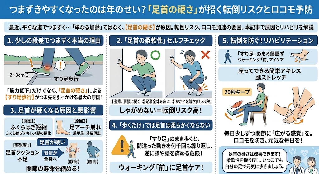 「最近、何もない平らな道でよくつまずく」「靴下を立って履けなくなった」。その原因を「単なる加齢による筋力低下だ」と諦めていませんか?実は、中高年者の転倒リスクを高めている大きな要因の一つに【足首の硬さ】があります。足首の関節が硬直すると重心のコントロールが難しくなり、ロコモティブシンドローム(運動器症候群)を加速させてしまいます。本記事では、足首が硬くなる原因と、安全な歩行を取り戻すためのリハビリのヒントをお伝えします。