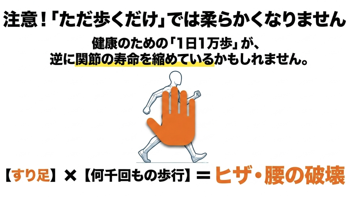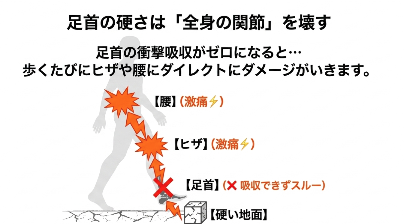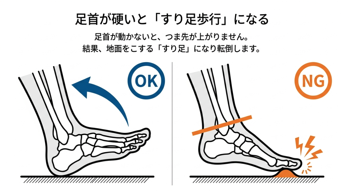 私たちは歩く時、無意識に足首を上に反らしてつま先が地面に引っかからないようにしています。しかし足首が硬くなるとこの動きが制限され、つま先が下がったまま足を前に振り出す【すり足歩行】になってしまいます。これが転倒の最大の原因であり、将来の寝たきり(ロコモティブシンドローム)へと直結する非常に危険なサインなのです。