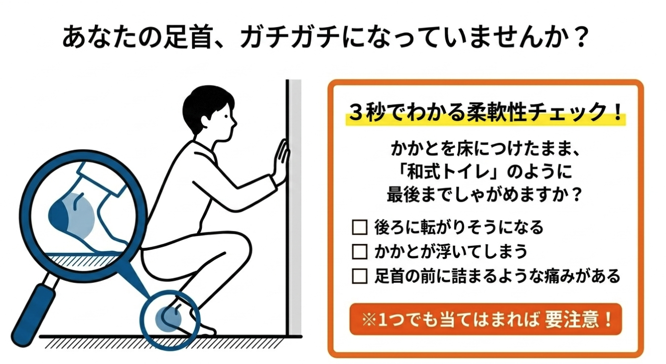 もし、最後までしゃがみきれずに後ろに転がりそうになったり、かかとが浮いてしまったり、足首の前に詰まるような痛みを感じた場合は、転倒リスクが高い「足首の硬さ」がある証拠です。