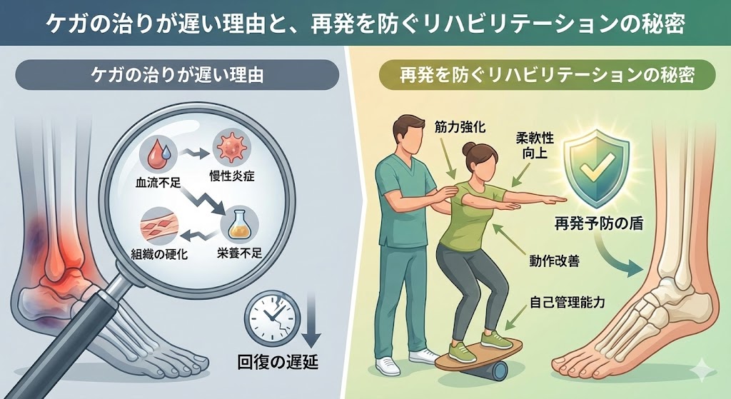 「肉離れは1ヶ月で治ったのに、アキレス腱炎は半年も痛い…」なぜこれほど治るスピードが違うのでしょうか? その答えは、組織の色を見れば一目瞭然。「赤」と「白」の決定的な違いである「血流」の量にあります。エンジンである「筋肉」と、ロープである「腱」。それぞれの役割と、完治のために欠かせない「リハビリテーション」の正しい進め方を解説します。
