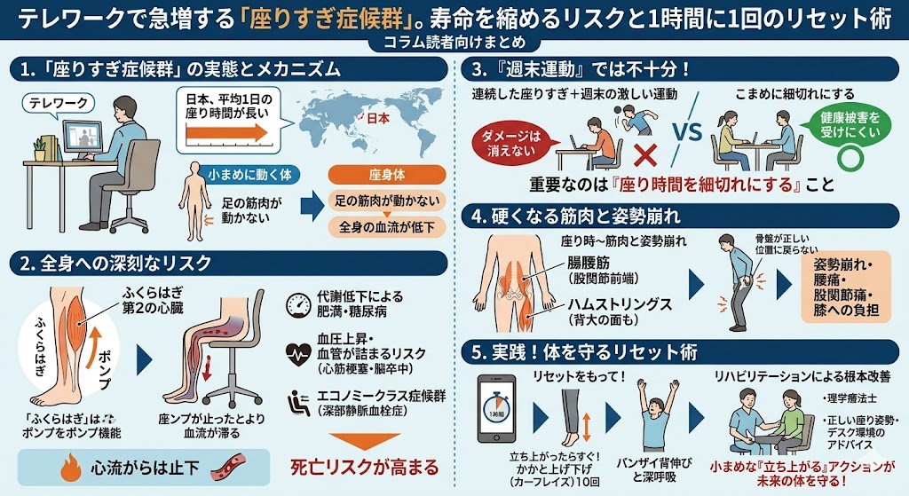 テレワークの普及などで、一日に座っている時間が長くなっていませんか? 実は「長時間の座りすぎ」は、肩こりや腰痛だけでなく、全身の血流を悪化させ、将来的な健康寿命を縮めるリスクがあるとして世界中で問題視されています。どんなに運動習慣があっても、連続して座り続けることの害は打ち消せません。本記事では「座りすぎ症候群」の恐ろしさと、1時間に1回できる簡単なリセット術、そしてリハビリテーションの視点を取り入れた予防法を解説します。