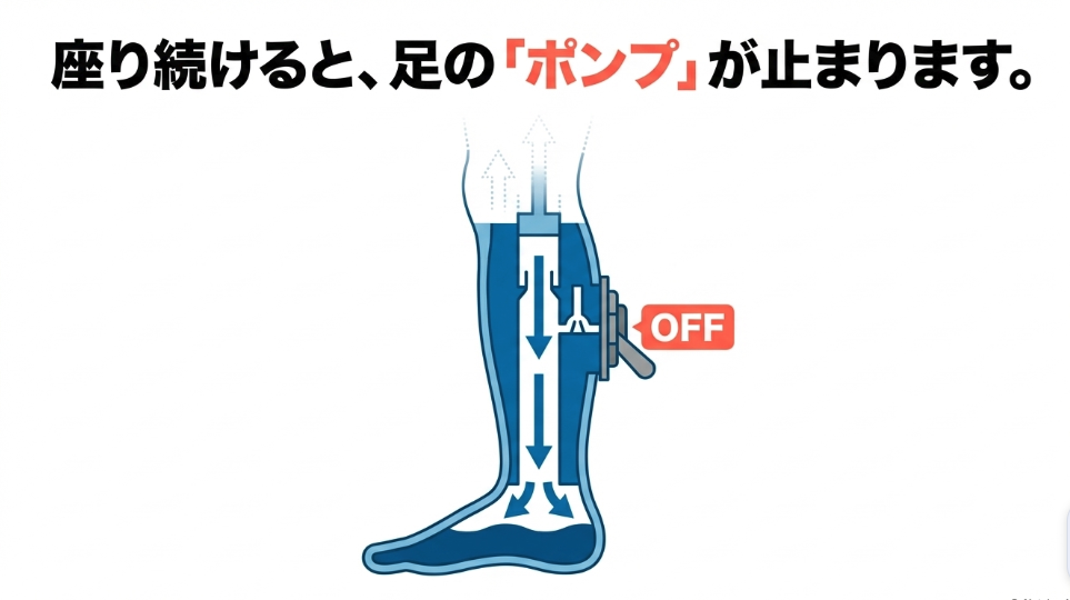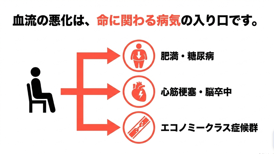 人間の体は本来、小まめに動くように作られています。座り姿勢が長く続くと、足の筋肉が動かされなくなり、全身をめぐる血液の循環が著しく低下してしまいます。これが、整形外科的な痛みだけでなく、全身の大きな病気へと繋がる入り口になってしまうのです。