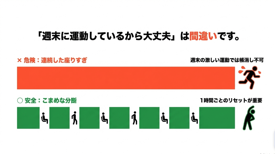 研究では、1日の座っている時間が長ければ長いほど、がんや生活習慣病による死亡リスクが高まることがはっきりと示されています。「座りすぎ」は、喫煙と同じくらい健康を脅かす危険な習慣だと警鐘を鳴らす専門家もいるほどです。