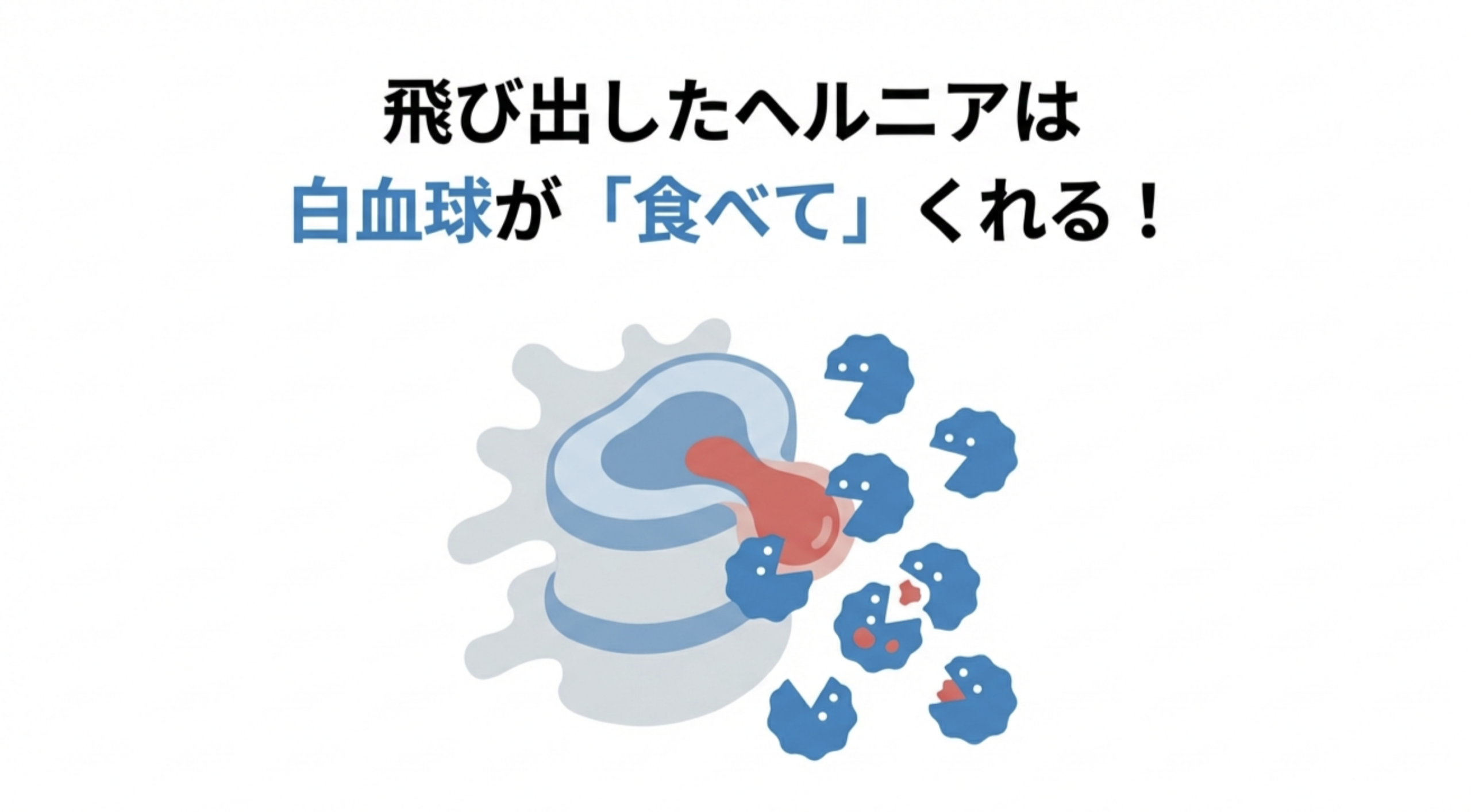 驚くべきことに、飛び出したヘルニアは、体にとって「異物」とみなされます。すると、白血球の一種であるマクロファージがその異物をパクパクと食べて吸収してしまうのです。