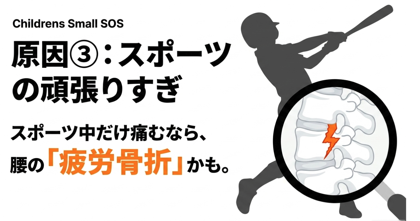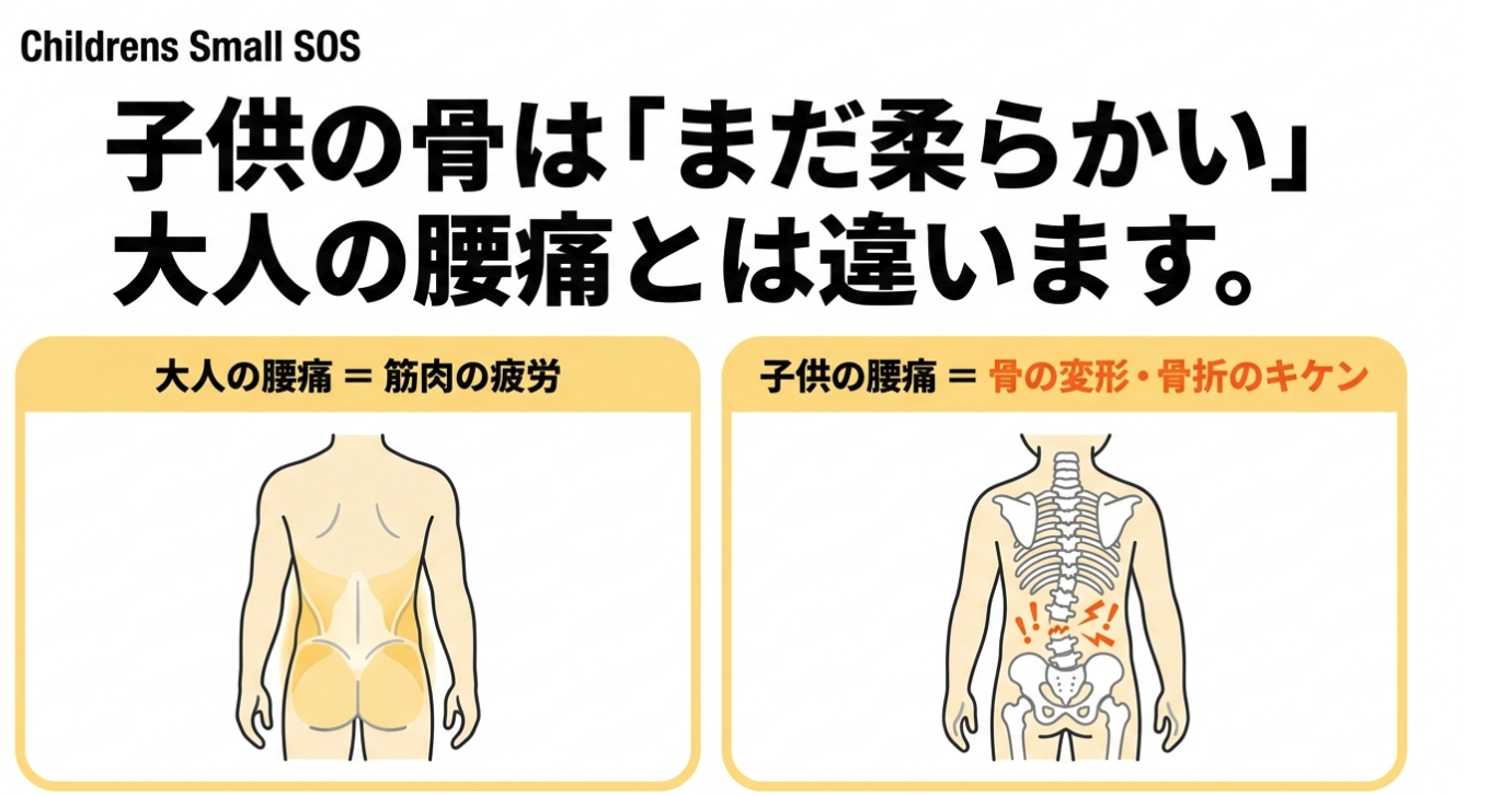 大人の腰痛の多くは筋肉の疲労や椎間板の劣化が原因です。一方、成長期の子供の背骨はまだ柔らかく、骨が完全に固まっていない状態です。そのため、大人と同じような感覚で痛みを放置していると、柔らかい骨自体が耐えきれず変形したり、疲労骨折を起こしたりする危険性が非常に高いのです。