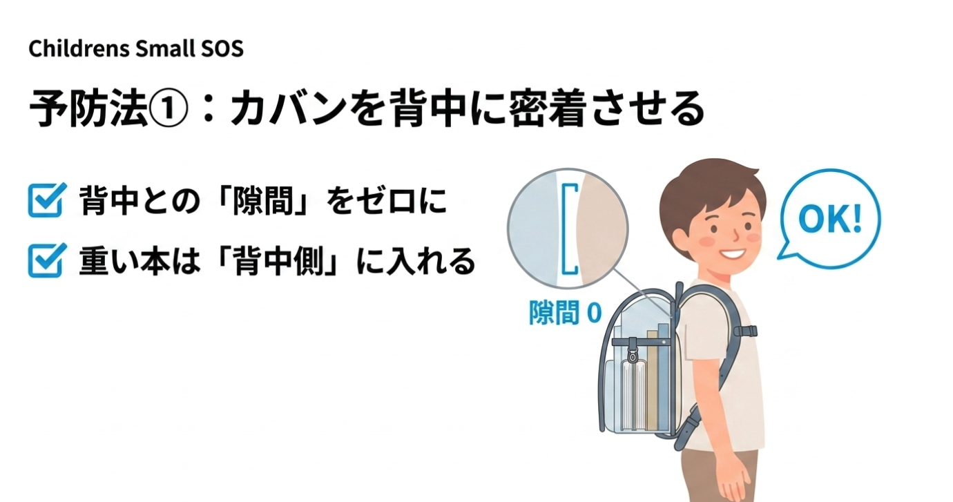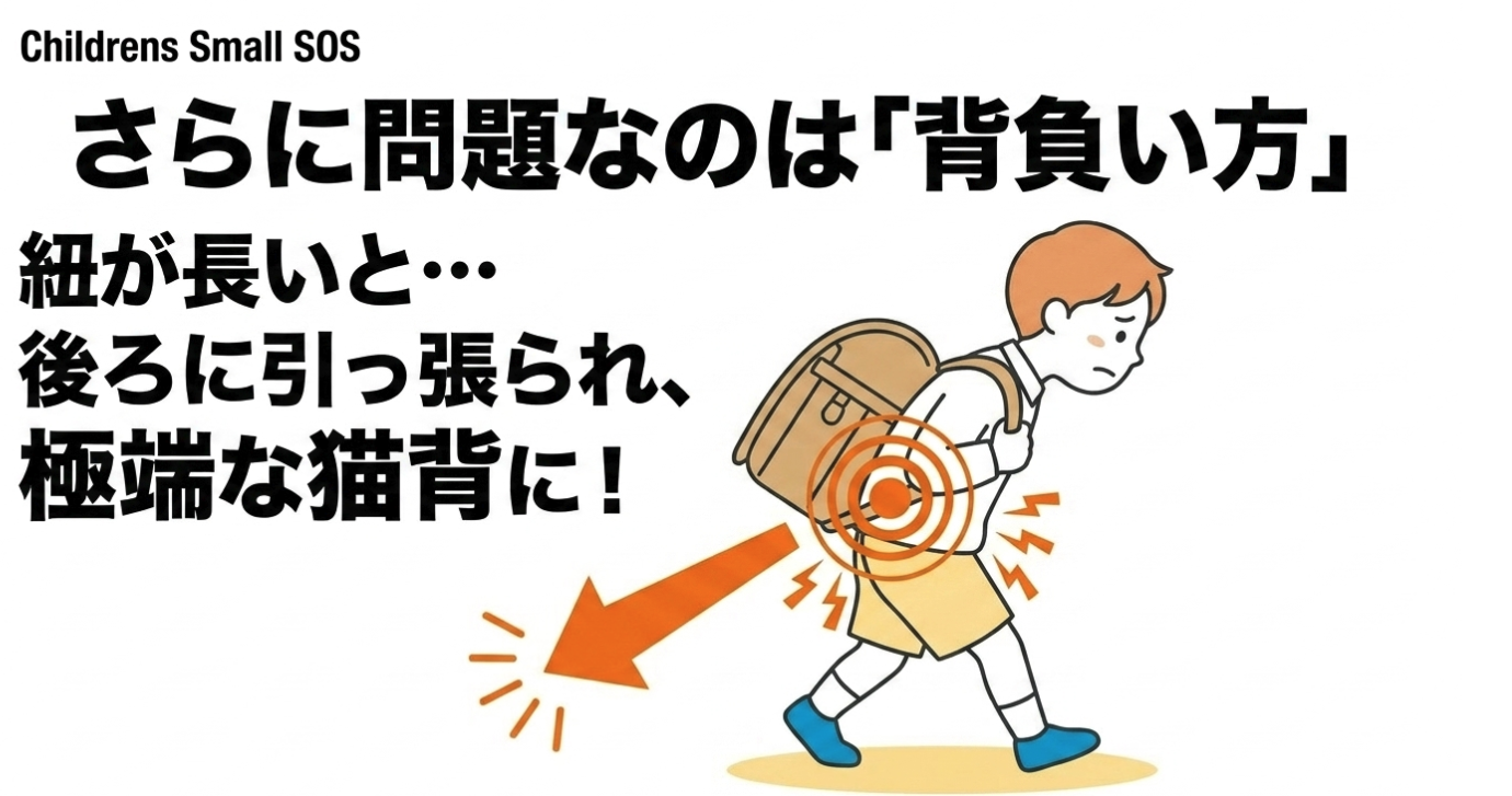 カバンの肩紐が長すぎると、重心が後ろに引っ張られます。子供はそれに抗うために極端に前かがみ(猫背)になったり、逆に腰を過剰に反らせたりします。この不自然な姿勢のまま毎日歩き続けることが、背骨に慢性的なストレスを与え腰痛を引き起こします。