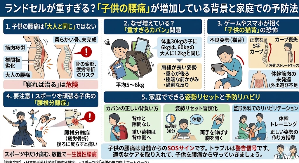 「子供が腰を痛がるなんて珍しい」と思っていませんか?近年、小学生や中学生の間で腰痛を訴えるケースが急増しています。その背景には【重すぎるランドセル】や【長時間の不良姿勢】など、現代特有の生活習慣が隠れています。子供の腰痛は放置すると、成長期の骨の変形を引き起こす恐れがあります。本記事では、子供の腰痛が増加している原因と予防法、正しい姿勢を保つ対策を解説します。