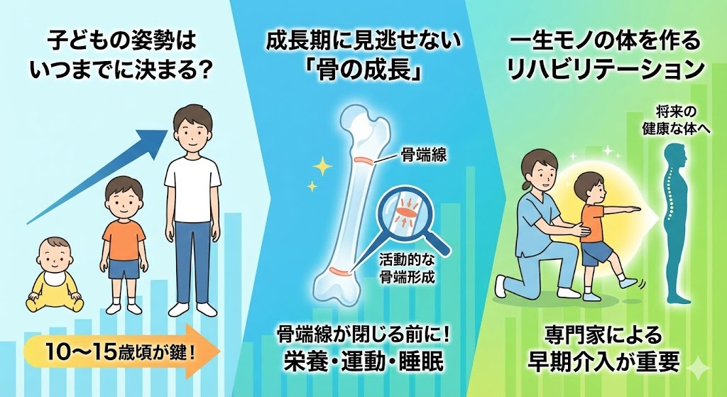 「何度言っても背中が丸まってしまう」「うちの子、姿勢が悪くて身長が伸びないのでは?」そんな悩みを抱える親御さんは少なくありません。子どもの骨格は成長とともに劇的に変化しますが、実は「正しい姿勢」を身につけるには、成長段階に合わせた「黄金のタイミング」が存在します。ただ注意するだけでは治らない理由と、整形外科での「リハビリテーション」がどのように役立つのか、その重要性を分かりやすく解説します。