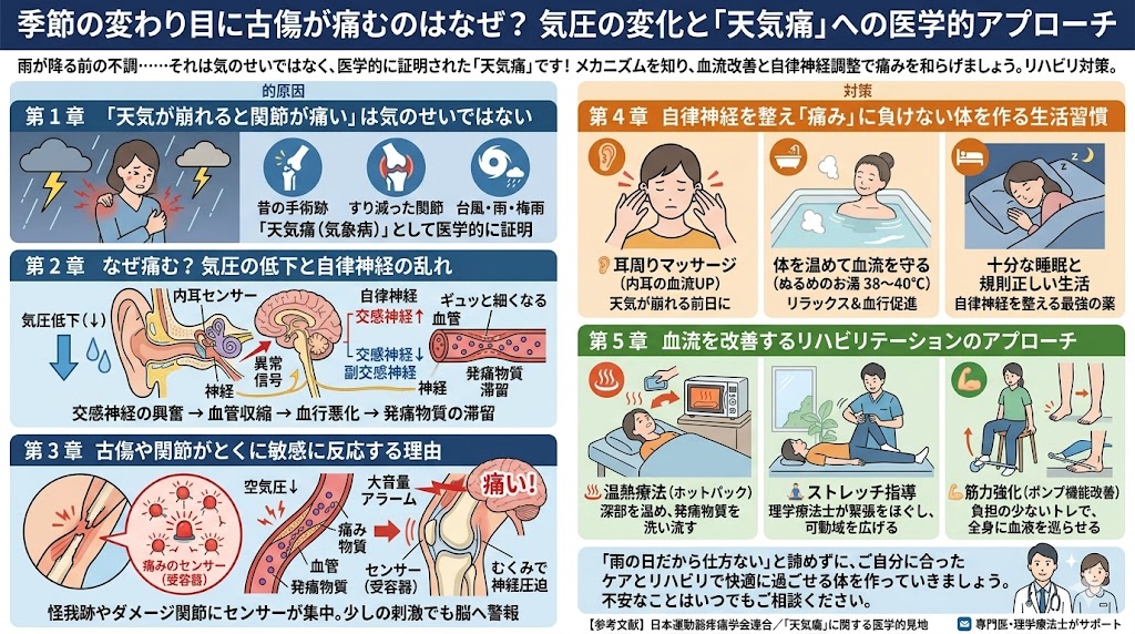 「雨が降る前になると、昔骨折した場所や膝の関節が痛む……」。そんな不調に悩んでいませんか? かつては気のせいだと言われがちでしたが、現在では気圧の変化が自律神経や痛みのセンサーに影響を与える「天気痛(気象病)」として医学的にも証明されています。我慢するしかないと思われがちですが、血流を改善し自律神経を整えることで痛みを和らげることが可能です。本記事では、天気痛が起こるメカニズムと、リハビリテーションの視点を取り入れた対策方法を解説します。