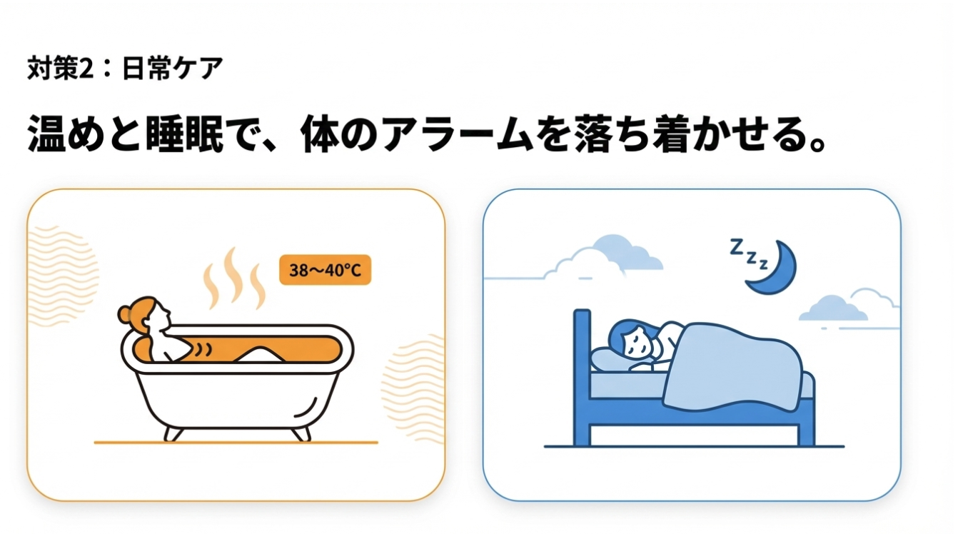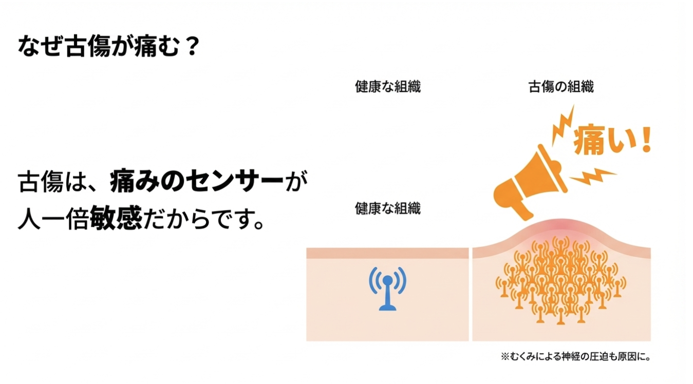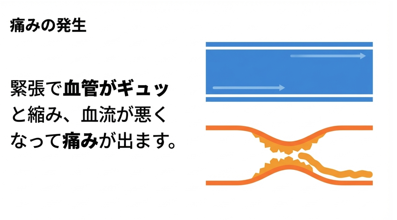 とくに、体を緊張させる「交感神経」が過剰に興奮してしまうと、血管がギュッと細く縮み、全身の血行が悪くなります。血流が滞ると、筋肉にしこりができたり、痛みの原因となる物質(発痛物質)が血液中に滞留したりするため、神経が刺激されて痛みを感じやすくなってしまうのです。