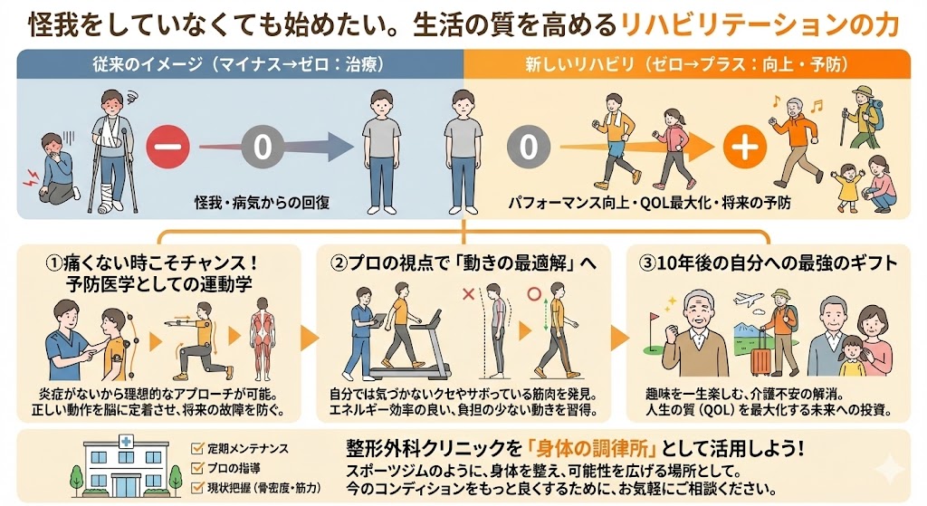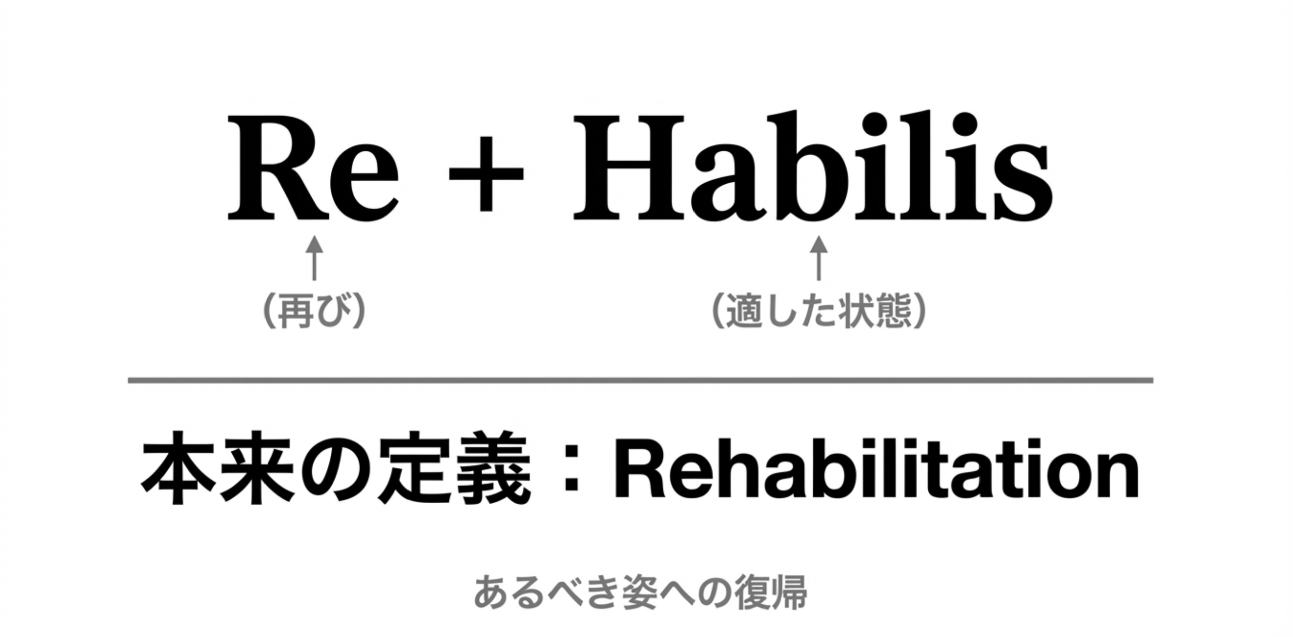 「リハビリテーション(Rehabilitation)」という言葉の本来の語源は、ラテン語で「再び(Re)」「適したものにする(Habilis)」、つまり「本来あるべき状態への復帰」を意味します。日本では長年、骨折や手術、脳卒中の後の回復訓練というイメージが強く、「怪我をしていない人は関係ない」と思われがちでした。