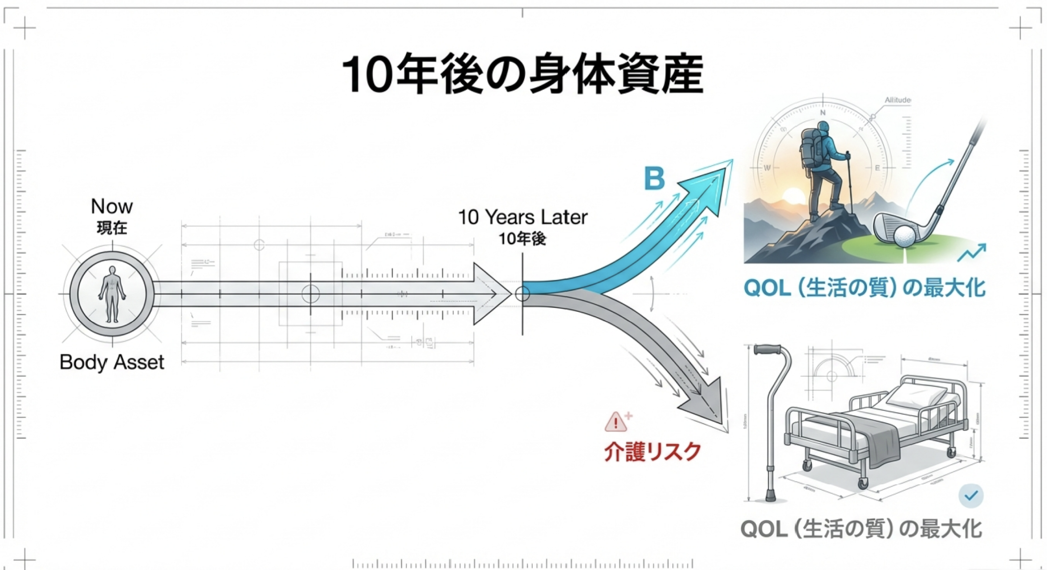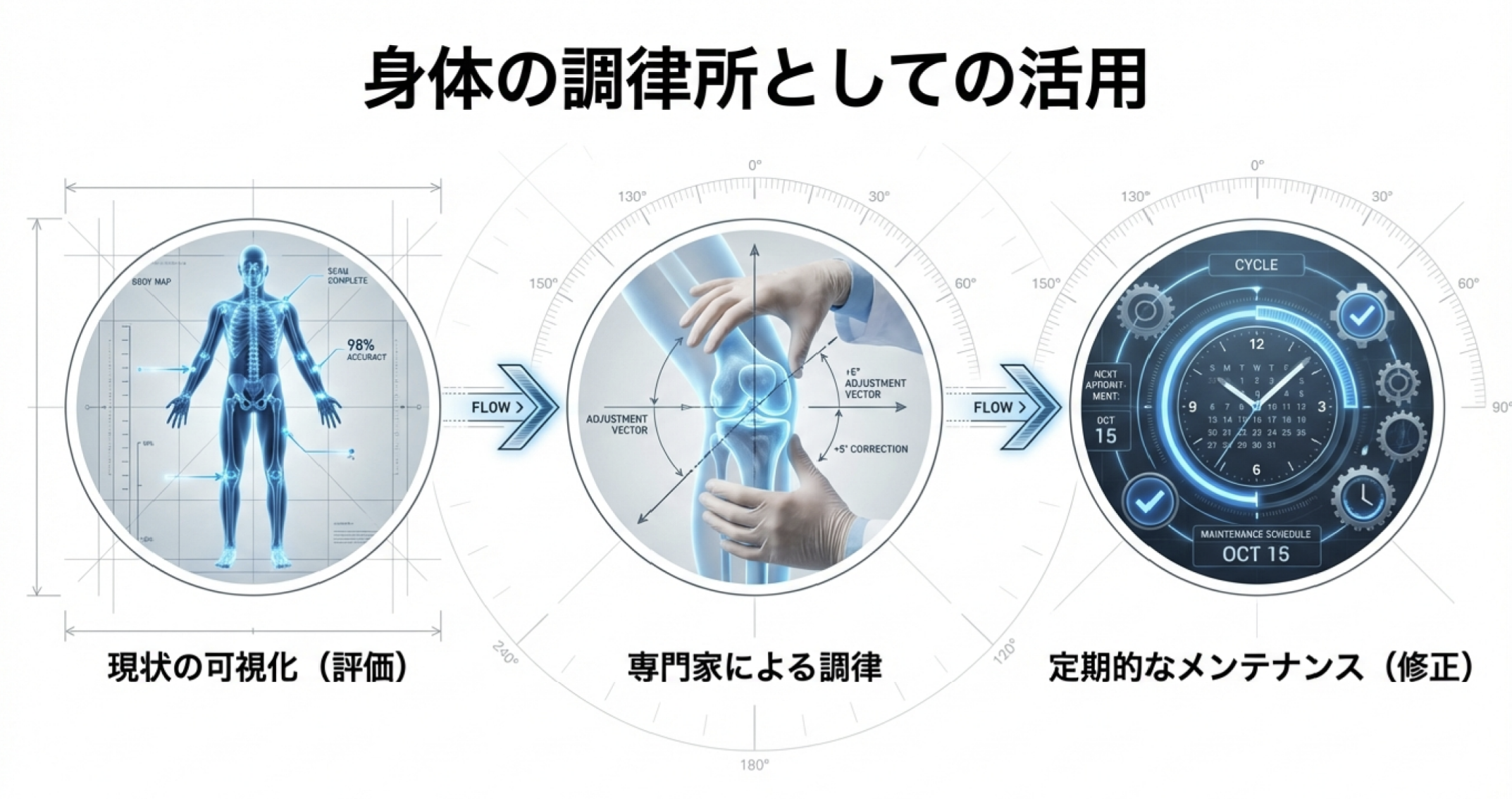 将来、膝や腰を痛めてから受診すれば、そこから元の状態に戻るまでには多くの時間と労力がかかります。しかし、今ある「違和感のない身体」をさらに磨いておけば、将来の故障を未然に防ぎ、一生病院通いを必要としない身体を手に入れることができるのです。