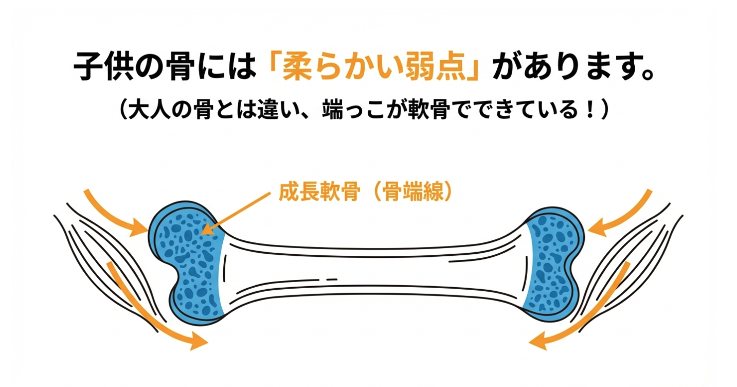 成長期の子供の骨には、端の方に「成長軟骨(骨端線)」と呼ばれる、柔らかくて成長の源となる部分があります。この部分は非常に繊細で、周囲の筋肉や腱から繰り返し強い力が加わると、剥離したり炎症を起こしたりしやすいのです。