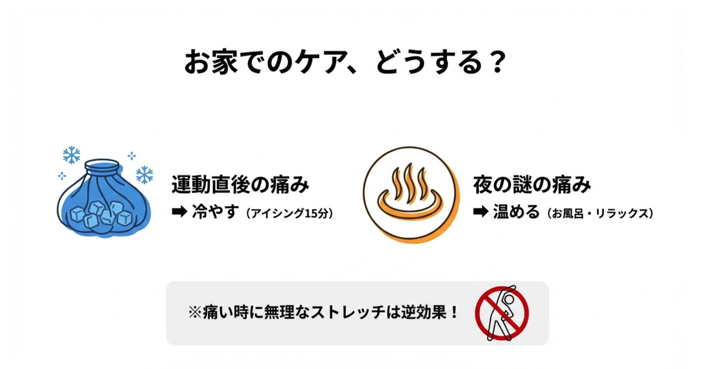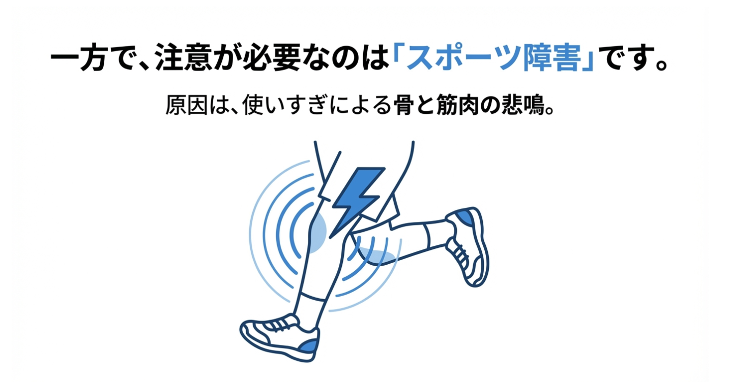 成長痛と混同されやすいのが、スポーツなどの過度な動きによって起こる「スポーツ障害(オーバーユース症候群)」です。こちらは、その名の通り身体を使いすぎること(使い方の間違い)で特定の部位に慢性的な炎症や損傷が起きている状態であり、適切な治療や指導が必要です。