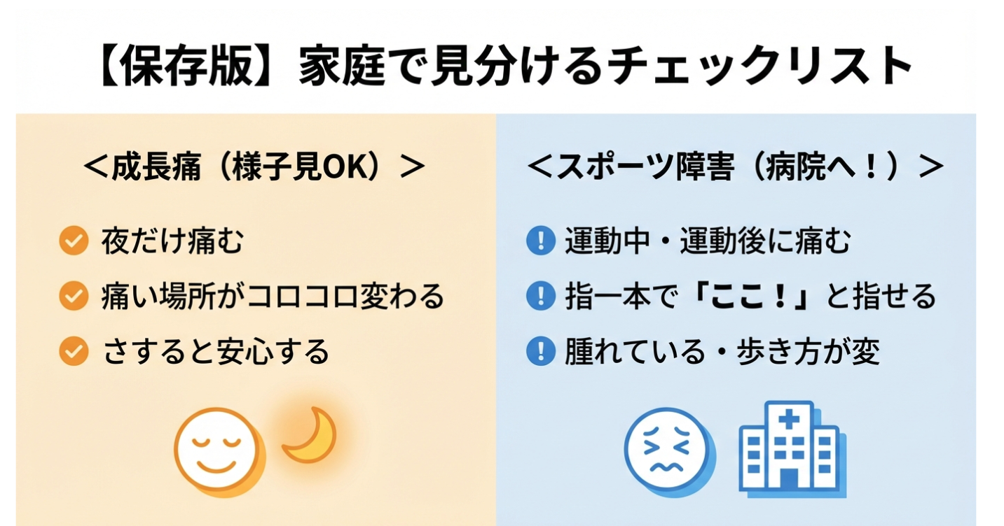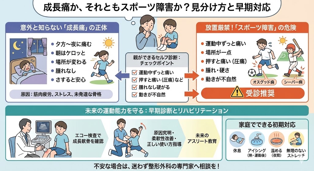 これらの障害は、成長痛とは異なり「安静にしていても痛みが続く」「動かすと常に痛い」といった特徴があります。放置すると将来的に関節の変形や、激しい痛みによる競技断念に繋がる恐れがあるため、見極めが極めて重要です。
