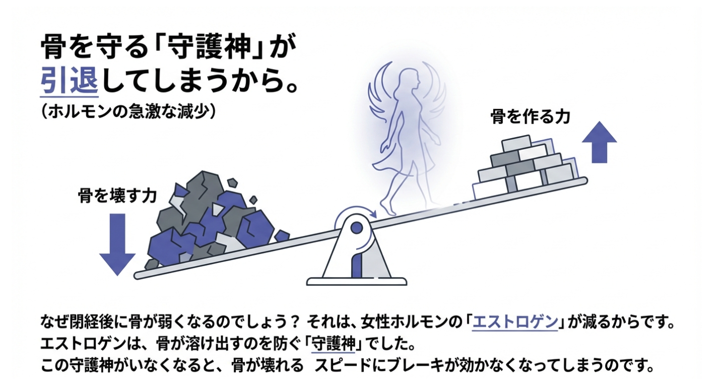 女性にとって、閉経は身体の大きな大きな節目です。この時期、体内で最も劇的に変化するのが、女性ホルモンである「エストロゲン」の分泌量です。実はこのエストロゲン、単に生殖を司るだけでなく、女性の骨の健康を強力に守るガーディアン(守護神)としての役割を果たしています。