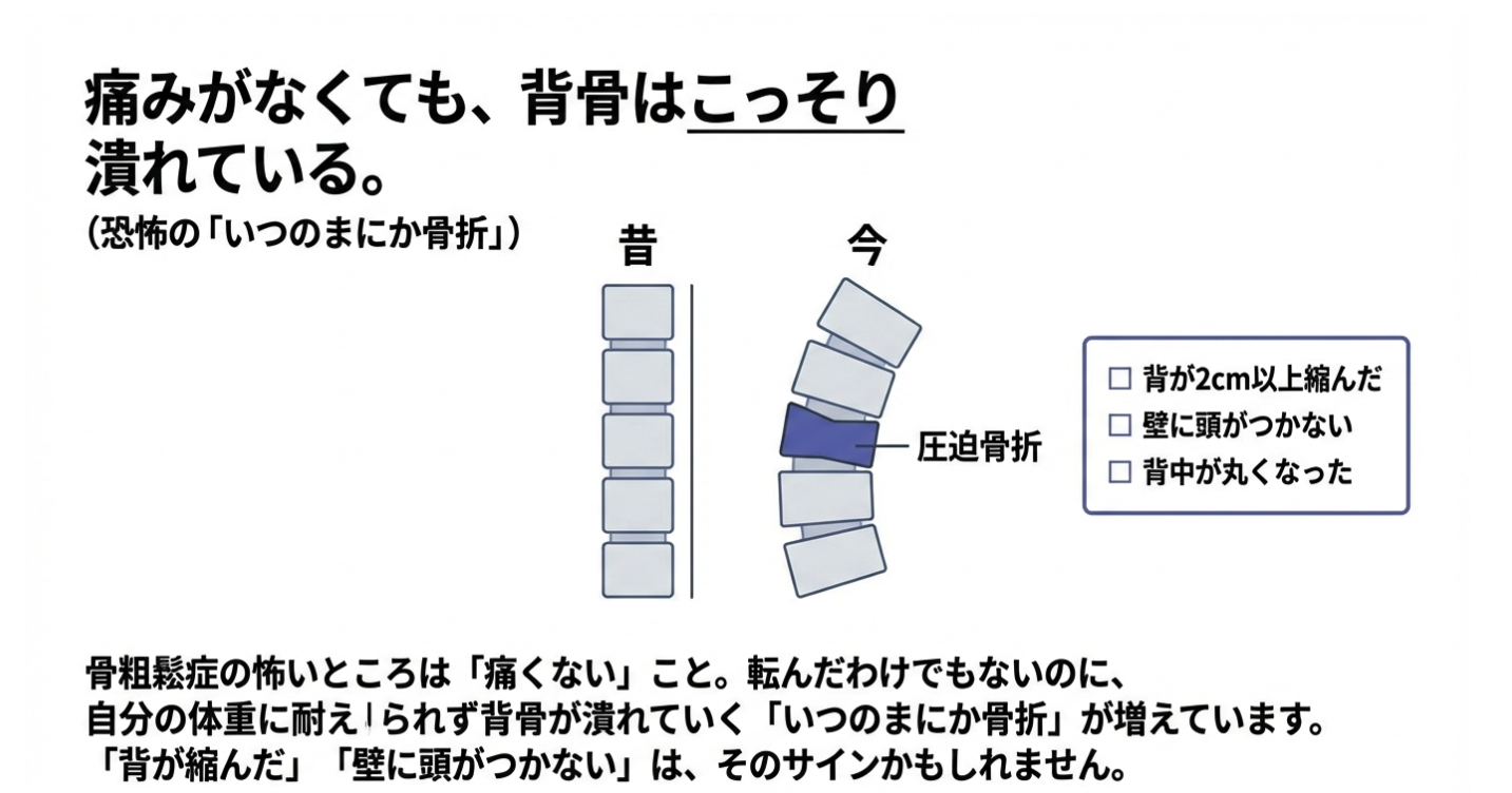 骨粗鬆症が恐ろしいのは、骨折するまで全く「痛みがない」という点です。特に閉経後の女性に多いのが、背骨の「圧迫骨折」です。転んだわけでも、ぶつけたわけでもないのに、自分の体重に耐えきれなくなった背骨が少しずつ潰れていく現象、それが「いつのまにか骨折」です。