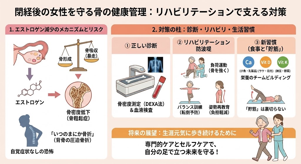 閉経を迎えると、女性の身体では骨を守ってくれていたホルモンが急激に減少します。これにより骨粗鬆症のリスクが一気に高まりますが、決して恐れる必要はありません。正しい知識に基づいた食事と、専門的なリハビリテーションを取り入れることで、骨の減少を抑え、生涯元気に歩き続ける身体を維持することができます。大切な転換期に向けた骨の守り方を詳しく解説します。