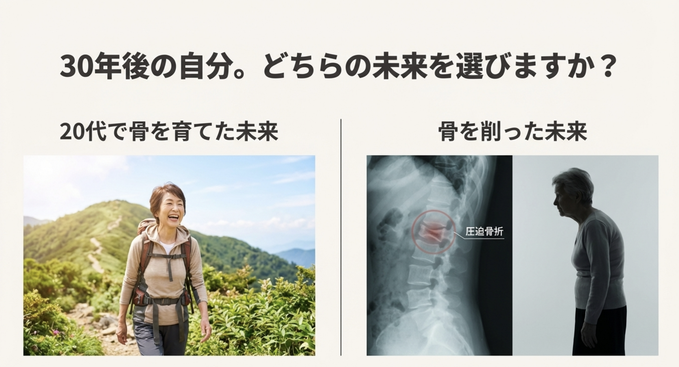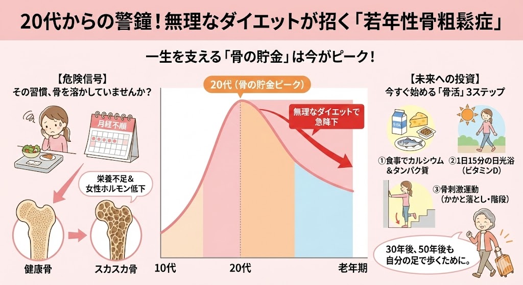20代の骨は、一生を支える「土台」です。この時期の不摂生は、数十年後の自分に対する深刻な負債となってしまうのです。