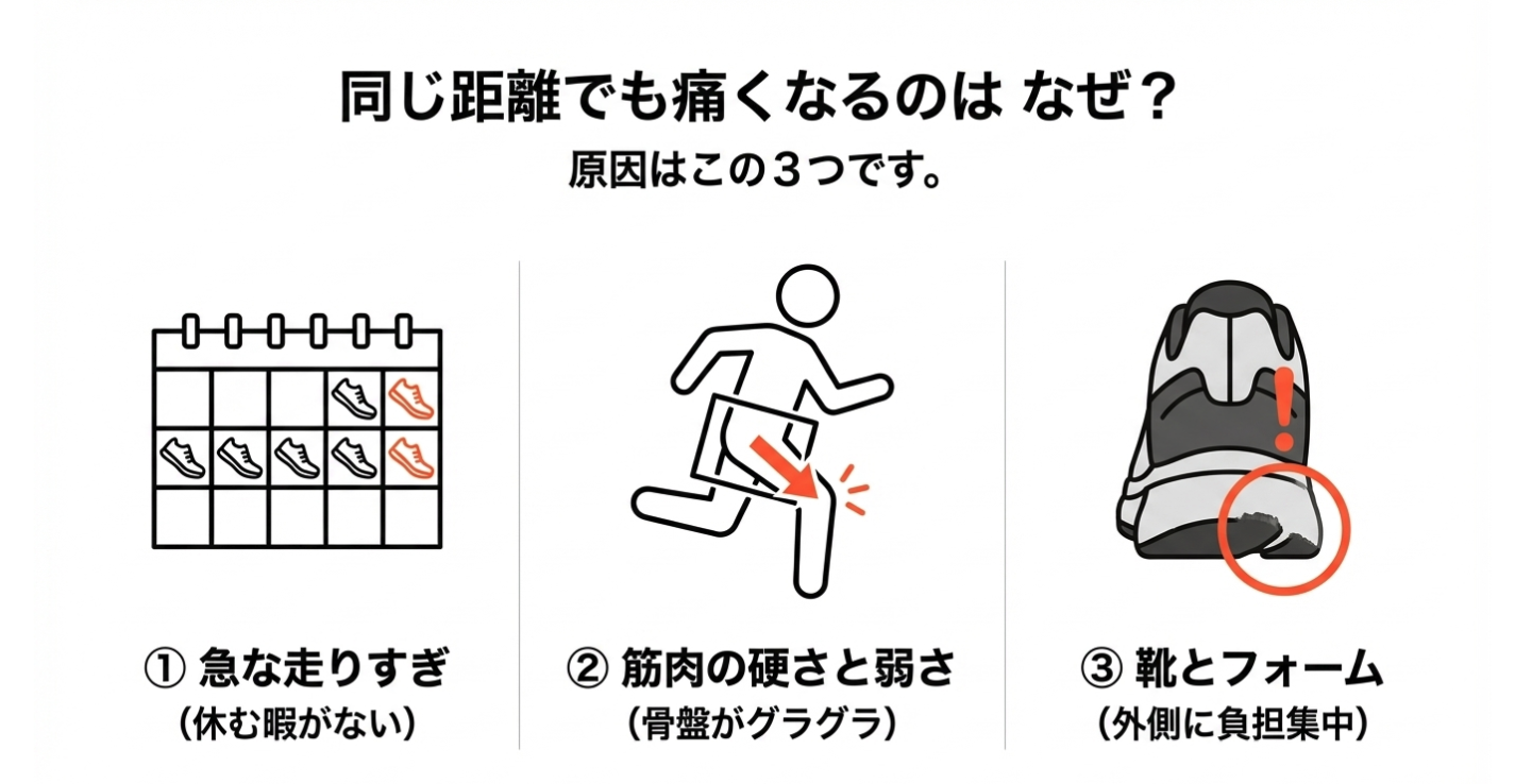 なぜ、腸脛靭帯炎になってしまうのでしょうか。同じ距離を走っていても痛くなる人と痛くならない人がいます。その背景には、主に以下の3つの原因が隠れています。