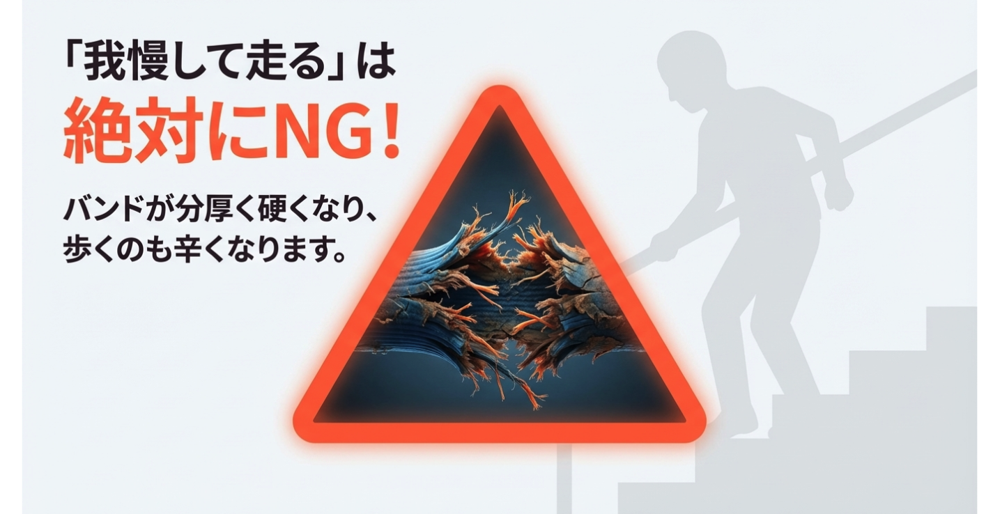 一番の原因は、いきなり走る距離や回数を増やすことによる「使いすぎ」です。ランニング初心者が張り切って毎日急に長距離を走ったり、マラソン大会に向けて急激に練習量を増やしたりすると、靭帯への摩擦回数が跳ね上がり、組織の回復が追いつかずに炎症を起こします。