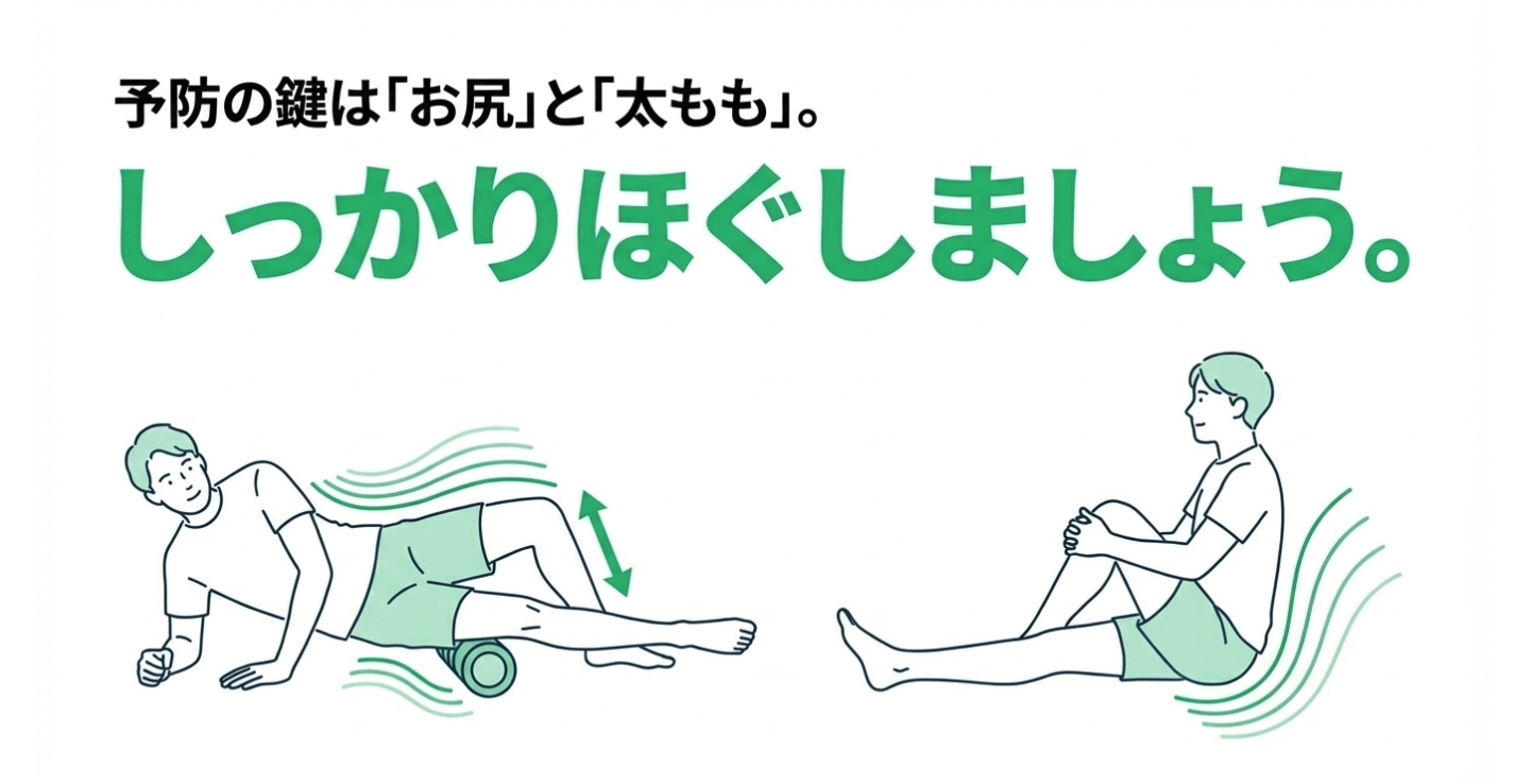 お尻の筋肉(大臀筋や中臀筋)や太ももの筋肉が硬くなっていると、腸脛靭帯への張力が強くなり、骨との摩擦が起きやすくなります。また、骨盤を水平に保つためのお尻の筋力が不足していると、走るたびに骨盤がグラグラと揺れ、脚の外側ばかりに負担が集中してしまいます。