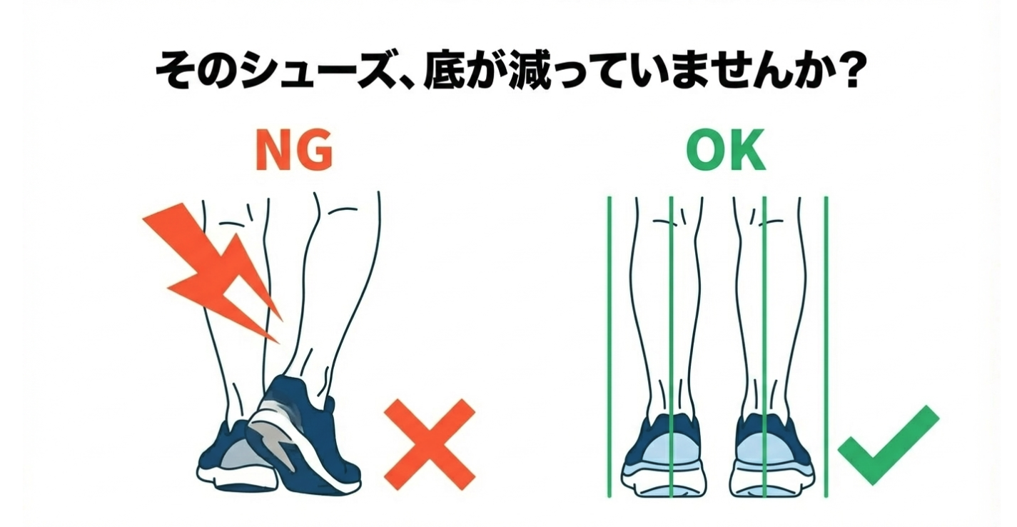 「O脚」の傾向がある方や、足の外側に極端に体重がかかるフォームで走っている方は、腸脛靭帯がピンと張りやすくなります。さらに、アスファルトなどの硬い路面ばかりを走ることや、靴底の外側がすり減ったランニングシューズを履き続けていることも、膝への衝撃を強める大きな要因となります。
