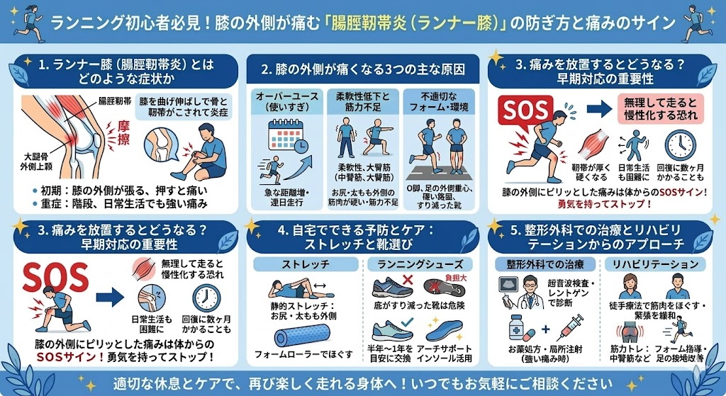 健康志向によるランニング人気の裏で、膝の外側に痛みを抱える方が増えています。その代表的な原因が、スポーツ障害の一種である「腸脛靭帯炎(ランナー膝)」です。